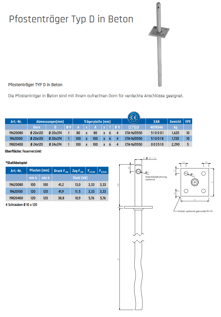 GH-Stützenfuss Typ D in Beton, Typ D ø20x120 Stahl feuerverzinkt ø20x374