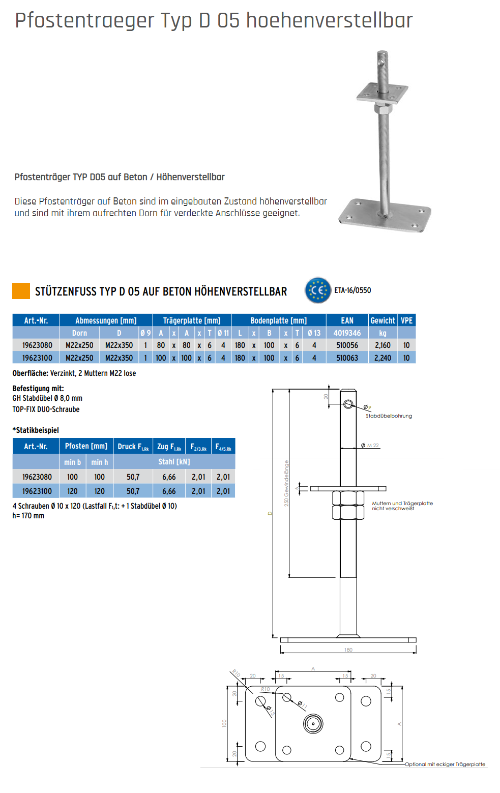 GH-Stützenfuss Typ D05 auf Beton höhenverstellbar, Typ D05 80x80 Stahl verzinkt M22x350