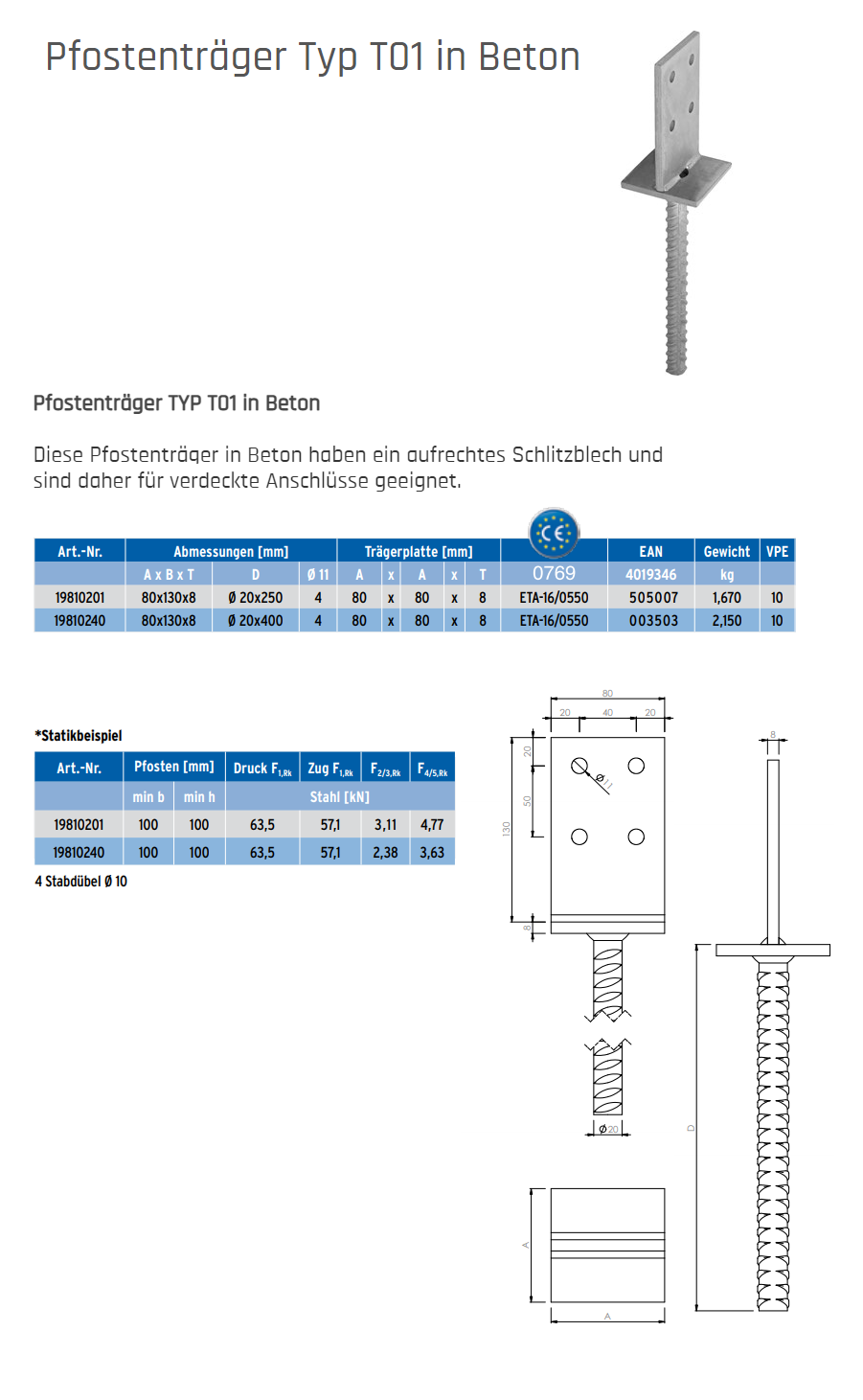 GH-Stützenfuss Typ T01 in Beton, Typ T01 80x130 Stahl feuerverzinkt ø20x250