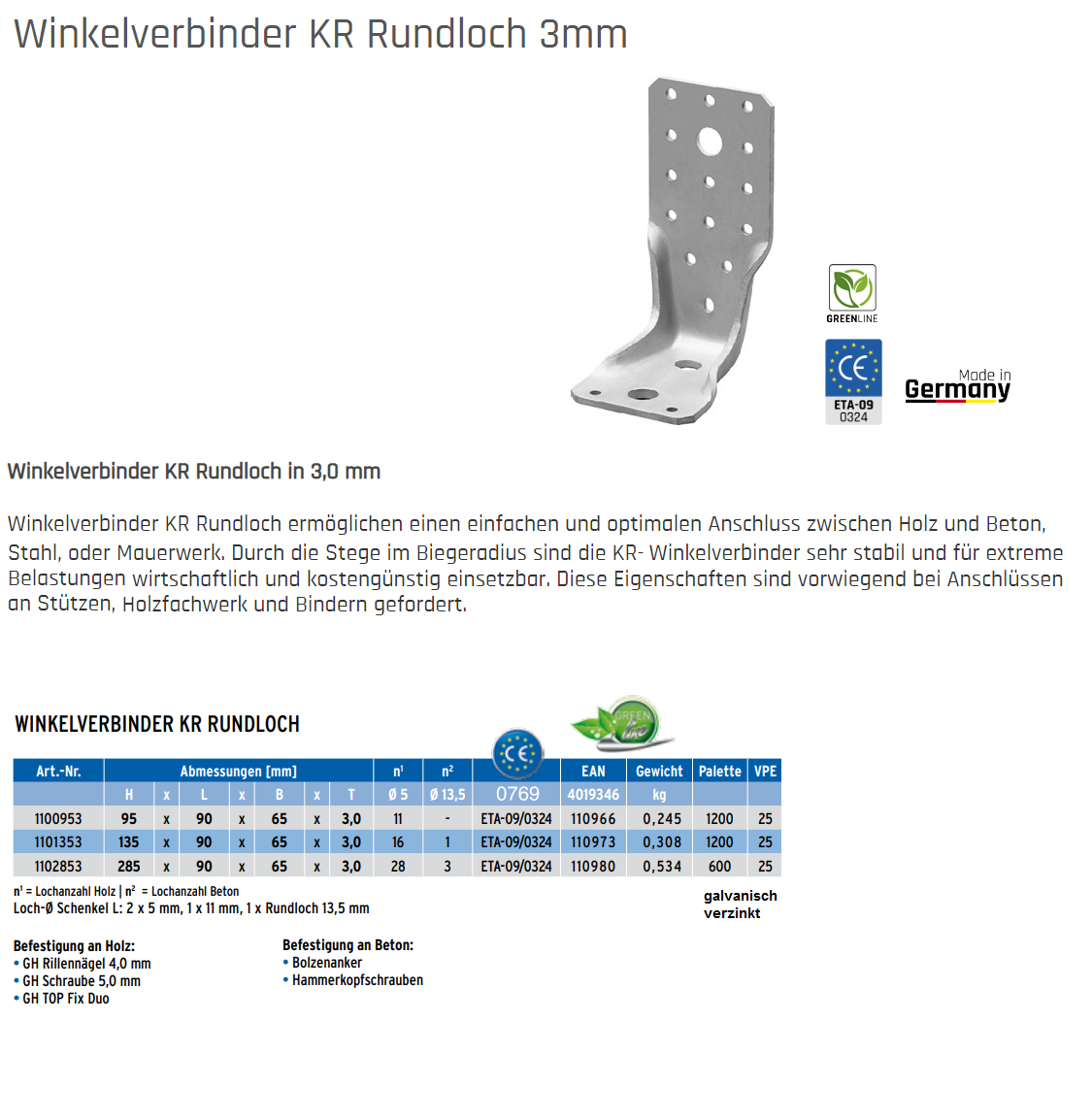 GH-Winkelverbinder Rundloch, Typ KR Stahl verzinkt 285x90x65