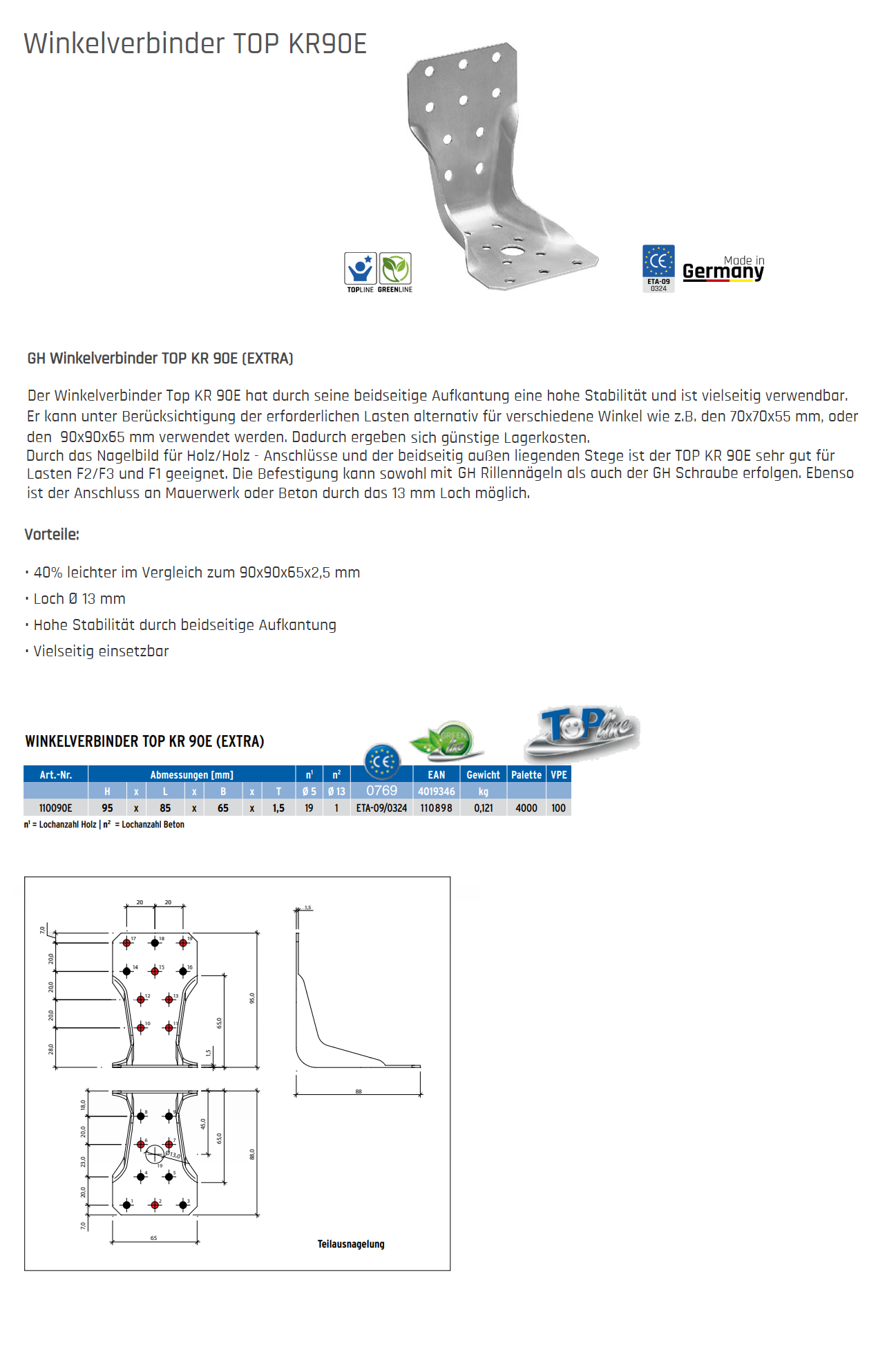 GH-Winkelverbinder TOP, Typ KR90E Stahl sendzimirverzinkt 95x85x65