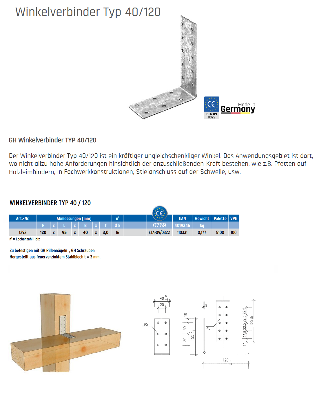GH-Winkelverbinder, Typ 40/120 Stahl sendzimirverzinkt 120x95x40