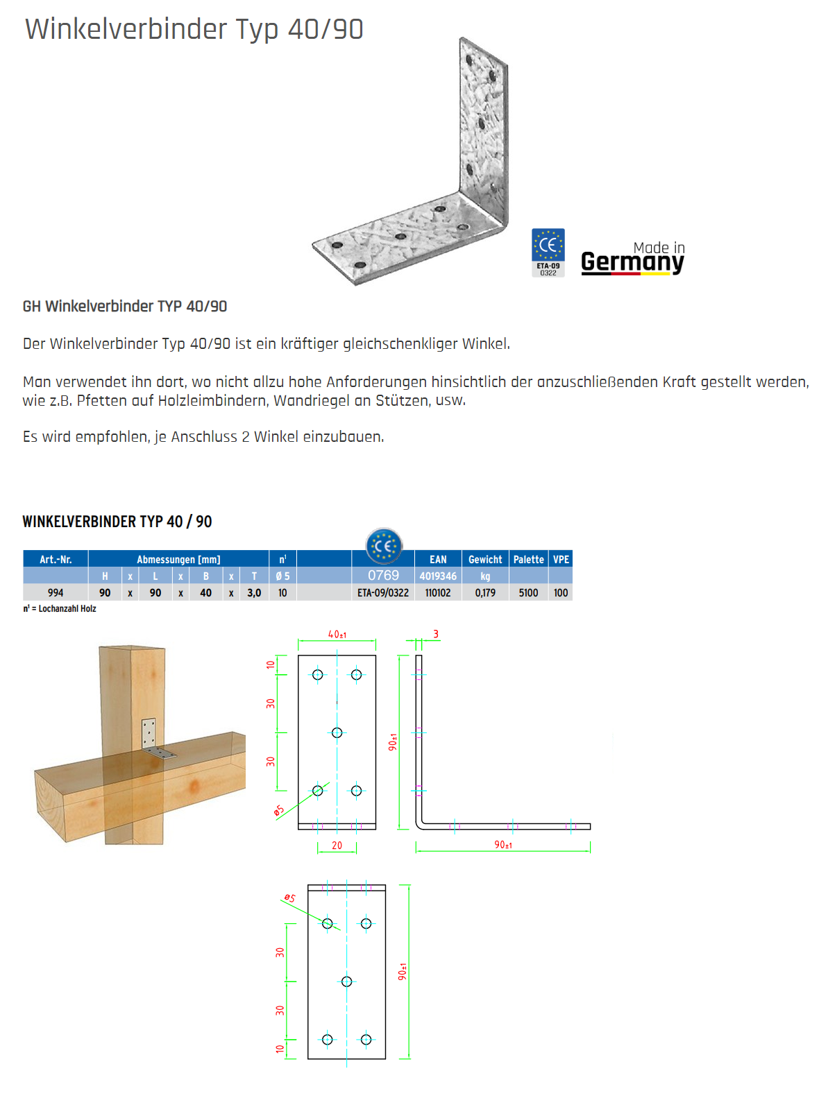 GH-Winkelverbinder, Typ 40/90 Stahl feuerverzinkt 90x90x40