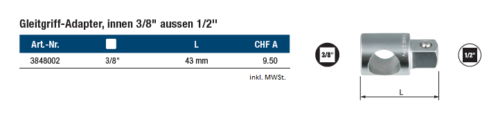 Gleitgriff-Adapter STARCH innen 3/8" aussen 1/2", Chrom-Vanadium-Stahl matt satiniert 43mm