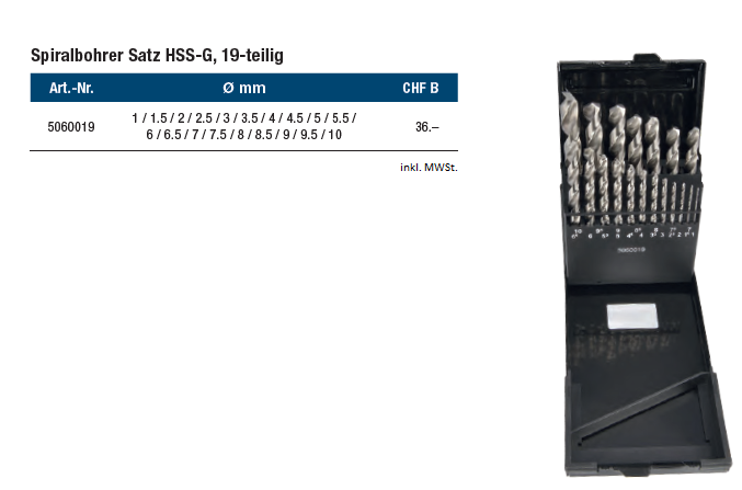 HSS-G Spiralbohrer Satz (0,5mm steigend) 19-tlg., DIN338 HSSG 1-10mm