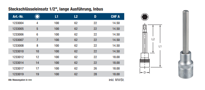 Inbus-Einsatz STARCH 1/2", lange Ausführung, Chrom-Vanadium-Stahl matt satiniert 17x100 1/2"