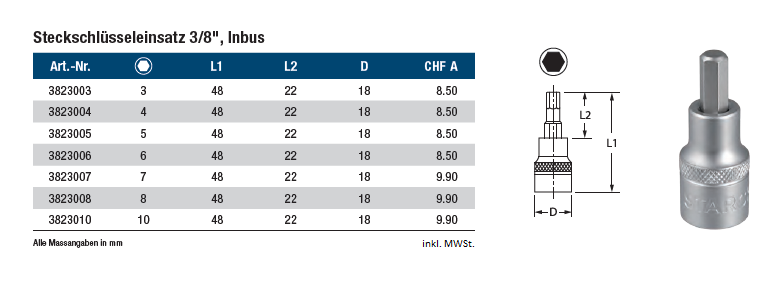 Inbus-Einsatz STARCH 3/8", Chrom-Vanadium-Stahl matt satiniert 6x22 3/8"