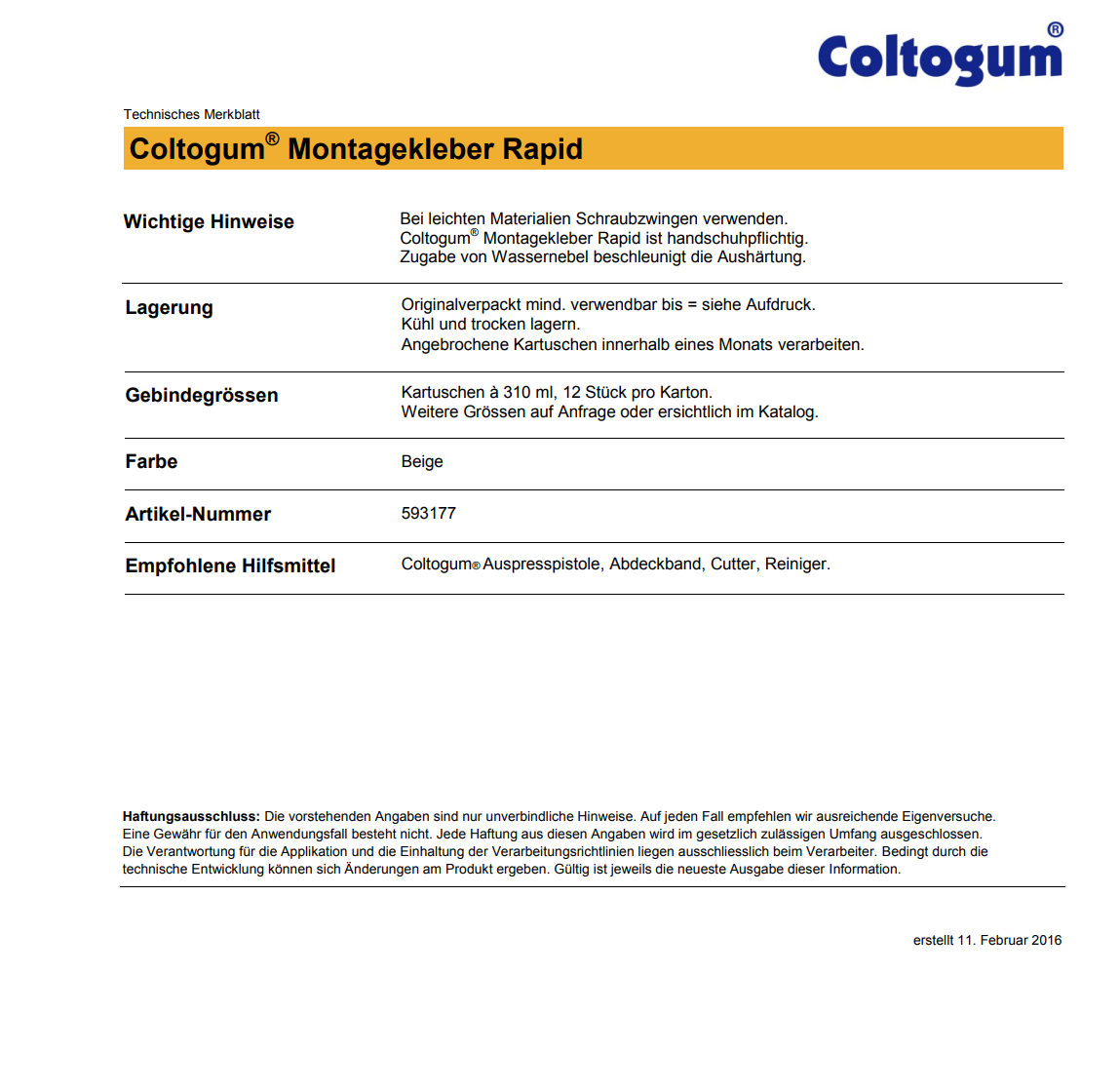 Coltogum Montagekleber Rapid, beige 310ml
