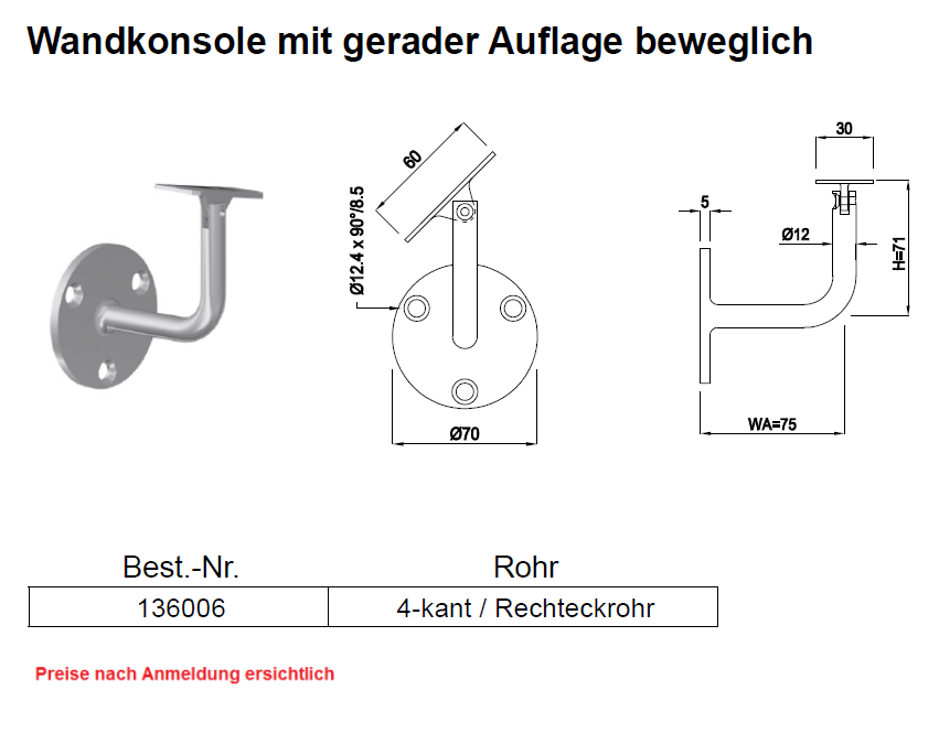 Wandkonsole mit 4.Kt. Auflager beweglich, Guss rostfrei WP 70x5 Bügel 12