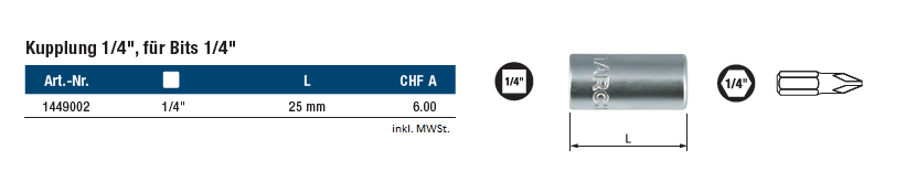 Kupplung STARCH 1/4" für Bits 1/4", Chrom-Vanadium-Stahl matt satiniert 25mm
