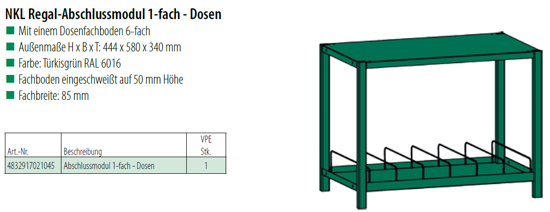 Küwi NKL Regal-Abschlussmodul 1-fach Dosen, Stahl, RAL6016, türkisgrün 444x580x340