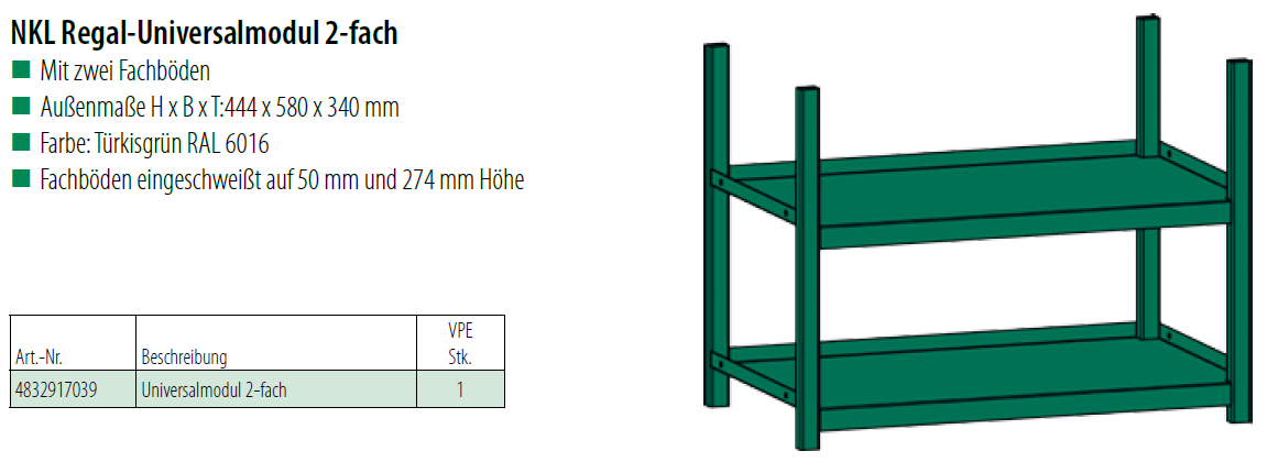 Küwi NKL Regal-Universalmodul 2-fach, Stahl, RAL6016, türkisgrün 444x580x340