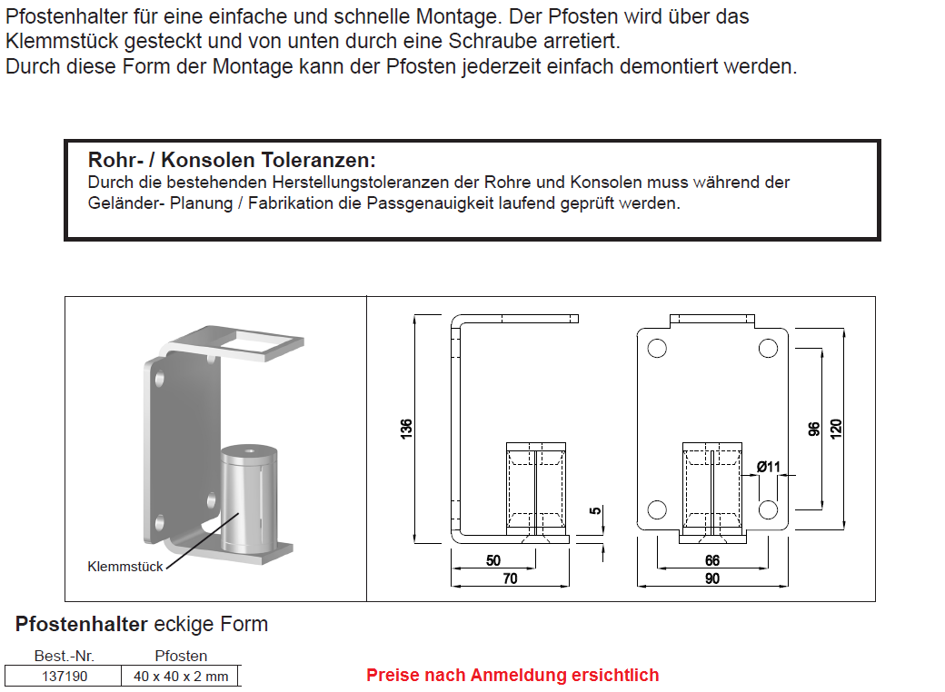 Pfostenhalter eckige Form, 1.4301 40x40x2