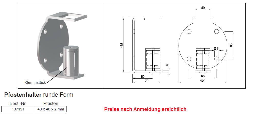 Pfostenhalter runde Form, 1.4301 40x40x2