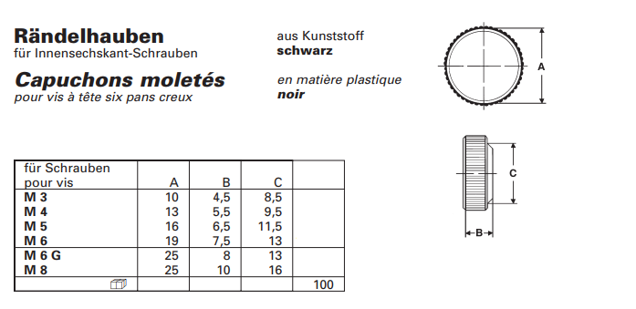 Rändelhauben für Imbusschrauben, schwarz M5