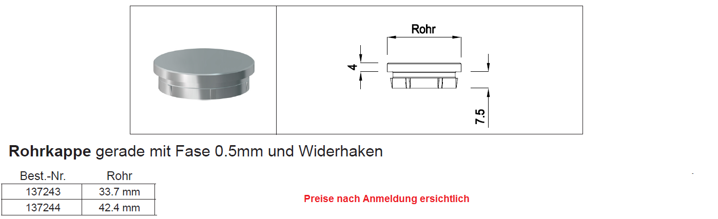 Rohrkappen gerade mit Fase und Widerhaken aus Guss, Guss CNS 1.4301 42,4x 2