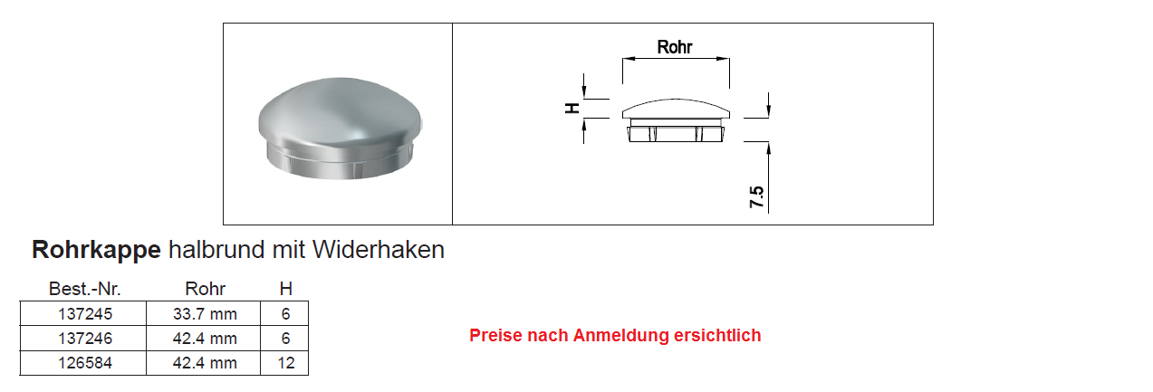 Rohrkappen halbrund Guss mit Widerhaken, Guss CNS 1.4301 33,7x2xH:6