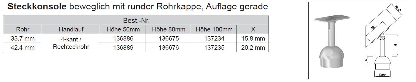 Steckkonsole bew. mit runder Rohrkappe f. 4kt.Rohr, 1.4301 33,7 H:50