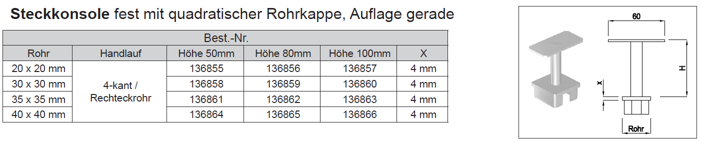 Steckkonsole fest Kappe quadratisch, 4kt. Auflage, 1.4301 35x35 H:50