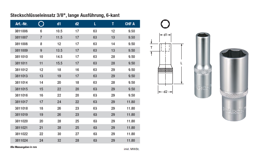 Steckschlüsseleinsatz STARCH 6-kant 3/8" lang, Chrom-Vanadium-Stahl matt satiniert 11x63 3/8"