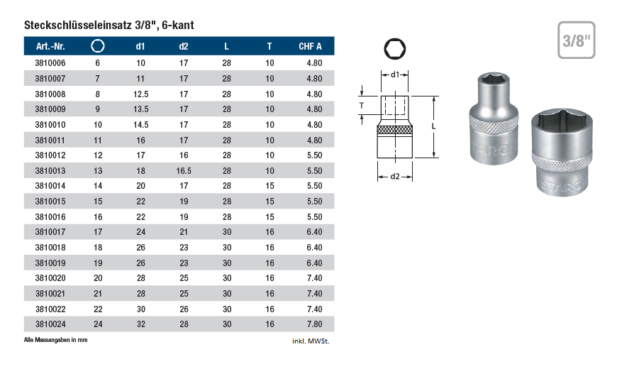 Steckschlüsseleinsatz STARCH 6-kant 3/8", Chrom-Vanadium-Stahl matt satiniert 15x28 3/8"