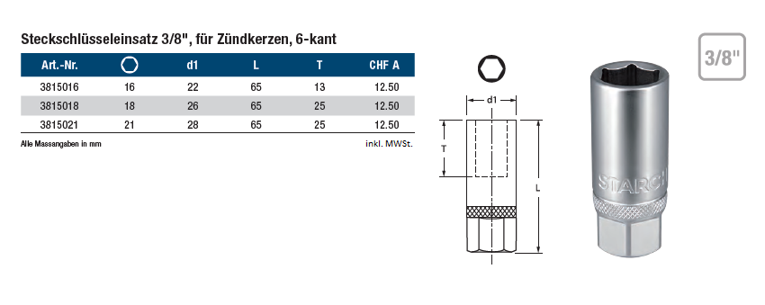 Steckschlüsseleinsatz STARCH 6-kant 3/8", Chrom-Vanadium-Stahl matt satiniert 21x65 3/8"