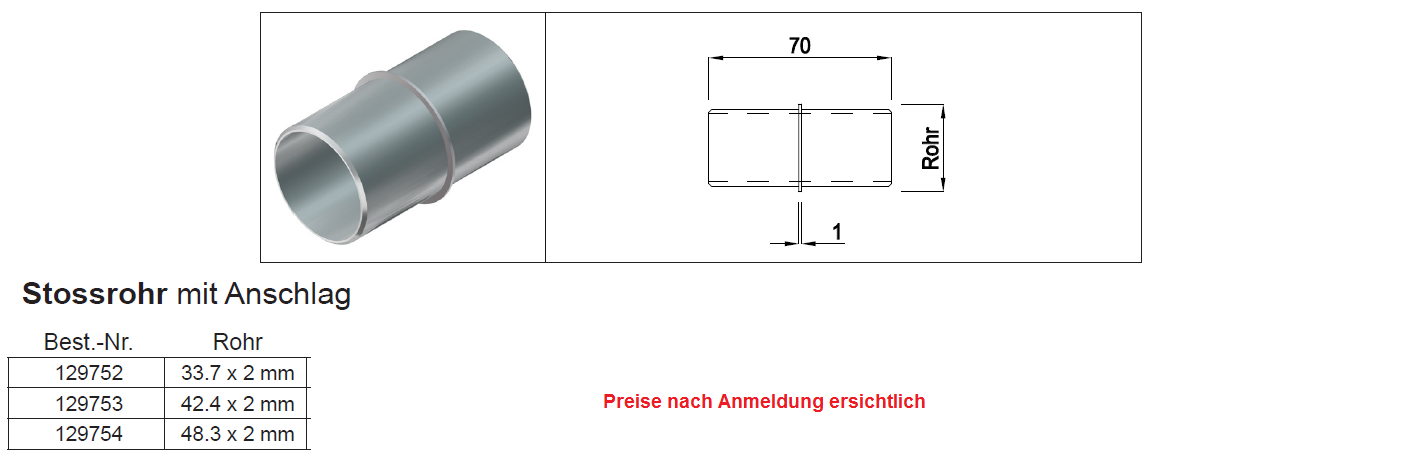 Stossrohre mit Anschlag, rostfrei 1.4301 42,4x70