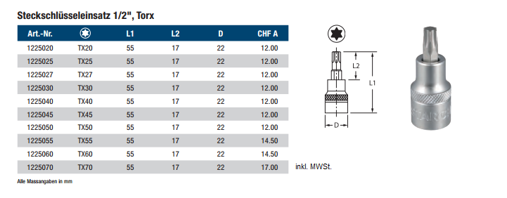 TX-Einsatz STARCH 1/2", Chrom-Vanadium-Stahl matt satiniert TX60x55 1/2"