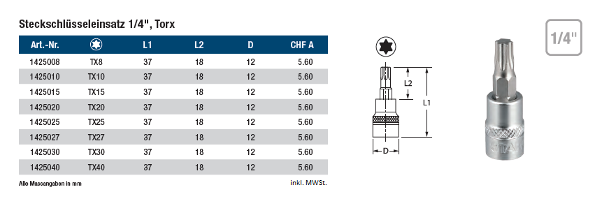TX-Einsatz STARCH 1/4", Chrom-Vanadium-Stahl matt satiniert TX10x37mm 1/4"