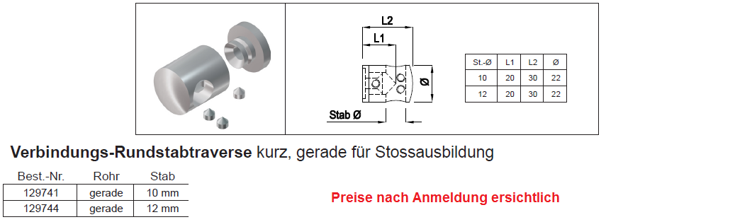Verbindungs-Rundstabtraverse kurz gerade, rostfrei 12