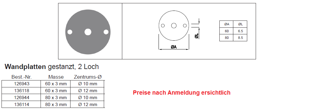 Wandplatte rund mit 2 Befestigungslöcher, Stahl 60x3 ZL10
